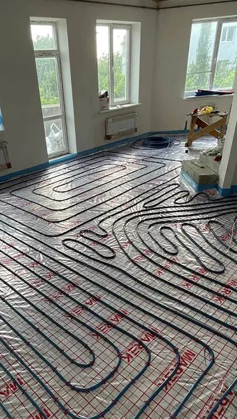 Vodní podlahové vytápění je ideální pro použití tepelného čerpadla jako zdroje energie, skutečné úspory dosáhnou 4 až 5násobku ve srovnání s plynovým nebo elektrickým podlahovým vytápěním.